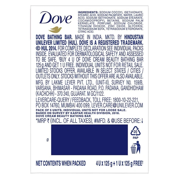 Dove Cream Beauty Bathing Bar For 24 Hour Nourished Skin with ¼ Moisturising Cream and Nutrient Serum (Pack of 5) 125g each