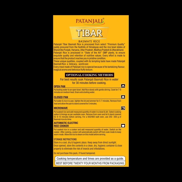 Basmati Rice is a premium long-grain rice known for its distinct aroma and delicate flavor. Tibar rice are broken rice grains in the range 60% to 75% of the length of the full-length rice. Patanjali Tibar Basmati Rice (Pusa Basmati 1121) variety is highly sought after for its superior quality, slender grains, and fluffy texture. PB 1121 is a long, slender, and fragrant Basmati variety of Rice. When cooked, the rice does not turn sticky and possesses minimum breadth-wise expansion. Cooked rice is fluffy white with pleasant aroma and is very tasty to eat.
